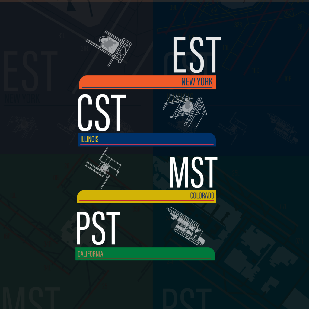 Contrast is used to emphasize the chosen airport within each composition. The selected airport is highlighted in full color, while unchosen airports appear at the bottom of the layout in white and gray, establishing a visual hierarchy and directing attention to the primary subject. Large typographic treatment identifies the time zone, while smaller, contrasting text indicates the state of the featured airport.
