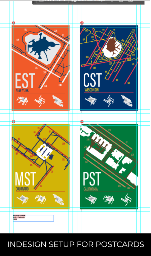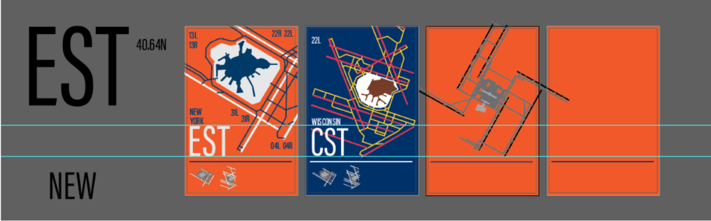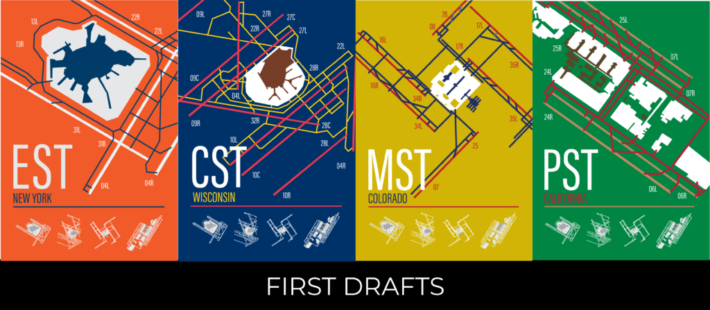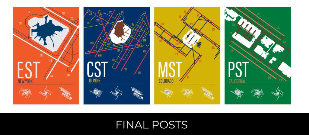 This project visualizes the most popular airports across each U.S. time zone in a poster and postcard format. Each selected airport is illustrated using simple line work to maintain visual consistency and focus on form rather than detail. The color palette for each design is drawn from the flag of the state in which the featured airport is located, reinforcing regional identity while creating clear visual variation across the series.